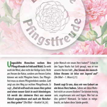 Ungezählte Menschen suchen ihre Pfingstfreude in Feld und Wald. Da weht wohl der Wind, aber nicht der Heilige Geist. Nicht am Herzen der Natur, sondern am Herzen Gottes können wir recht Pfingsten feiern. Das Pfingstfest muss zu einem Pfingsterlebnis werden. Gott zeigt uns den Weg zur rechten Pfingstfreude. Er sagt: „Und ich will euch ein neues Herz geben und einen neuen Geist in euch hineinlegen. Ich werde das steinerne Herz aus eurem Fleisch wegnehmen und euch ein fleischernes Herz geben“ (Die Bibel – Hesekiel 36,26).