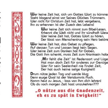 Die Weitergabe von Missionsschriften aus unserem Verlag geschieht in Eigenverantwortung der verteilenden Privatperson oder Gemeinde. Bitte vermeiden Sie unseriöse Schriftenverteilung und Schriftenauslagen, da dadurch unserem wichtigen Anliegen, Menschen für Jesus Christus zu gewinnen, geschadet wird.