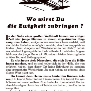 Die Weitergabe von Missionsschriften aus unserem Verlag geschieht in Eigenverantwortung der verteilenden Privatperson oder Gemeinde. Bitte vermeiden Sie unseriöse Schriftenverteilung und Schriftenauslagen, da dadurch unserem wichtigen Anliegen, Menschen für Jesus Christus zu gewinnen, geschadet wird.